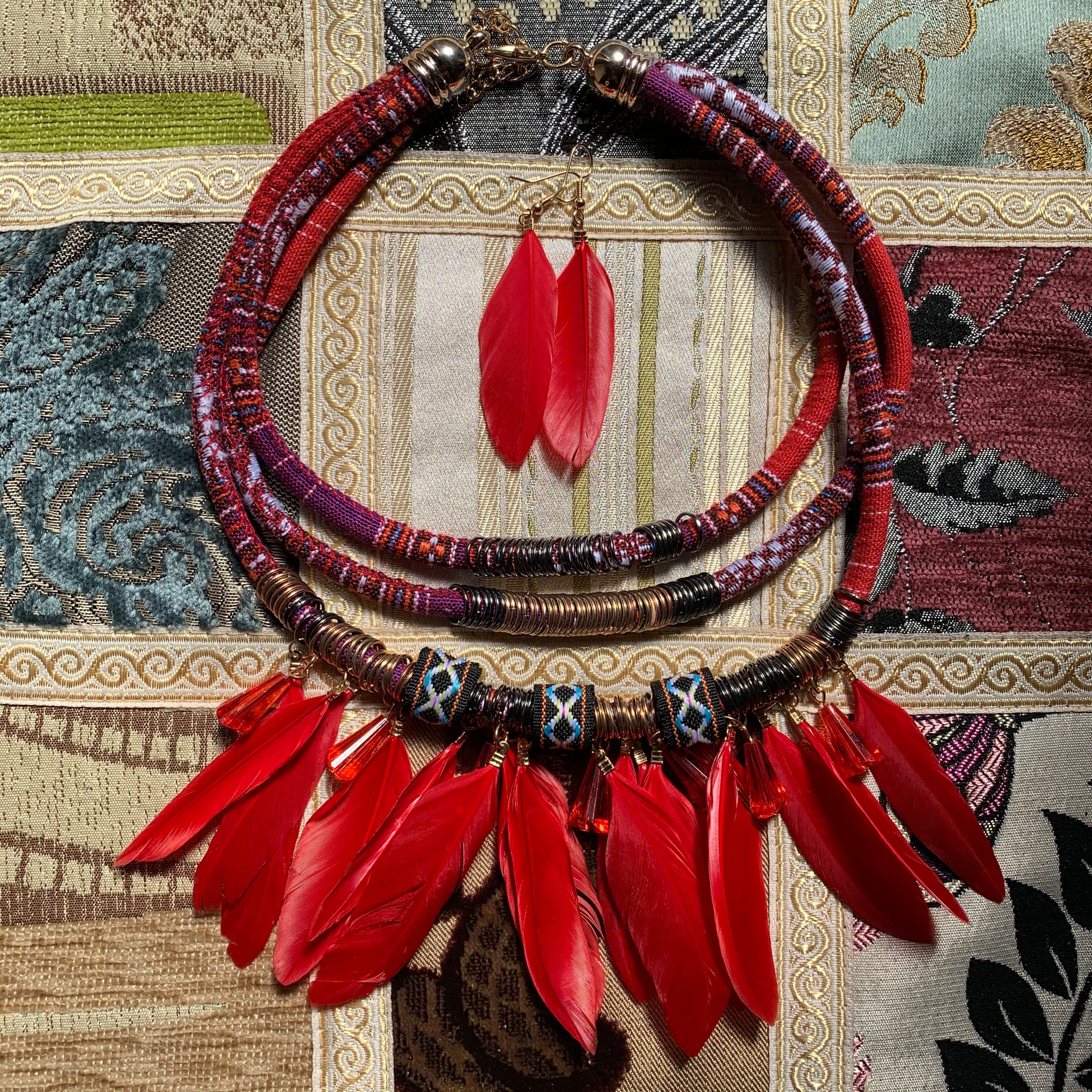 羽を使用したGypsy調のネックレスとピアスのセット。