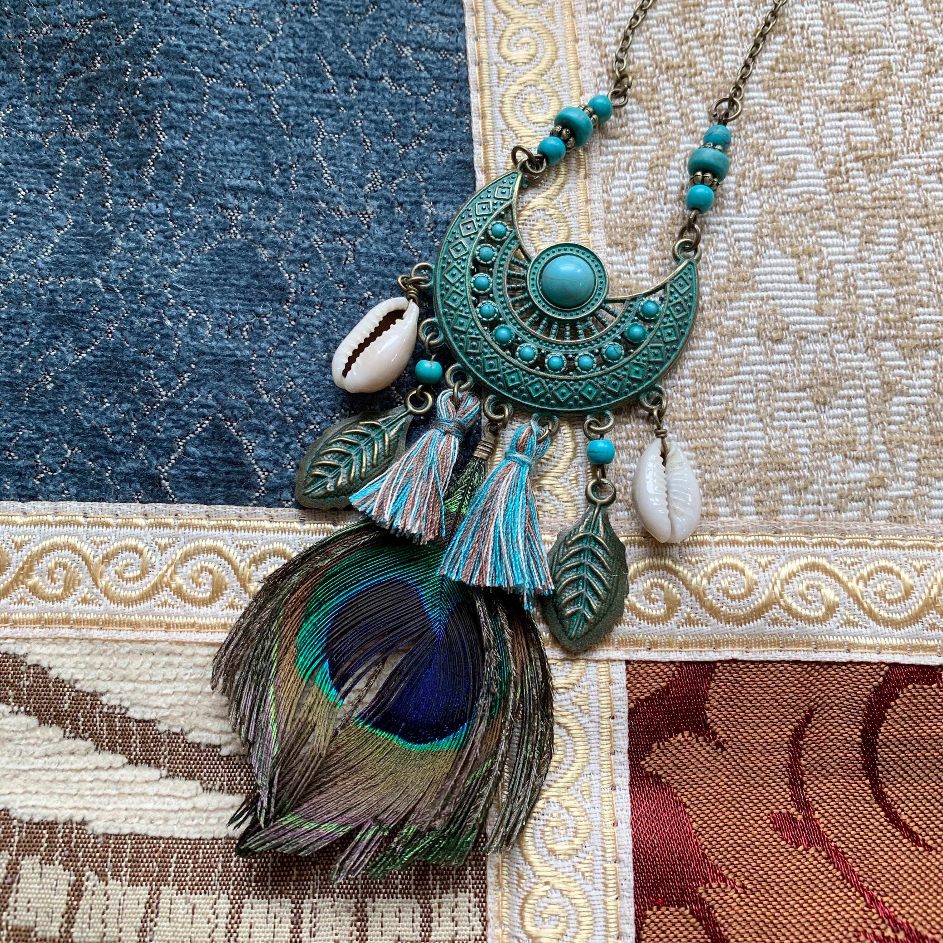 貝、タッセル、羽のモチーフ、孔雀羽がありジプシー好きにはたまらない1品です。