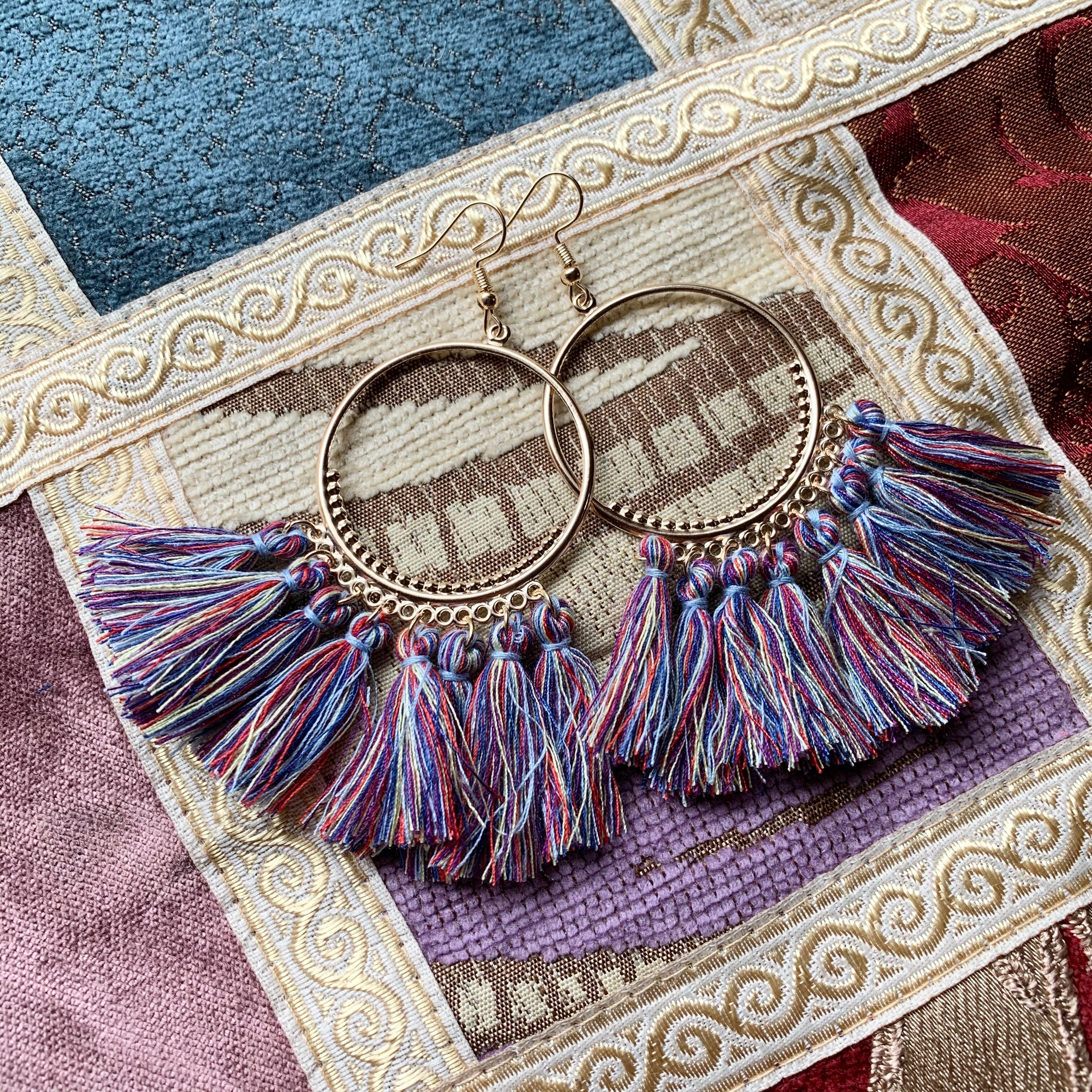 タッセルがたっぷりあしらわれたリング型ピアスです。