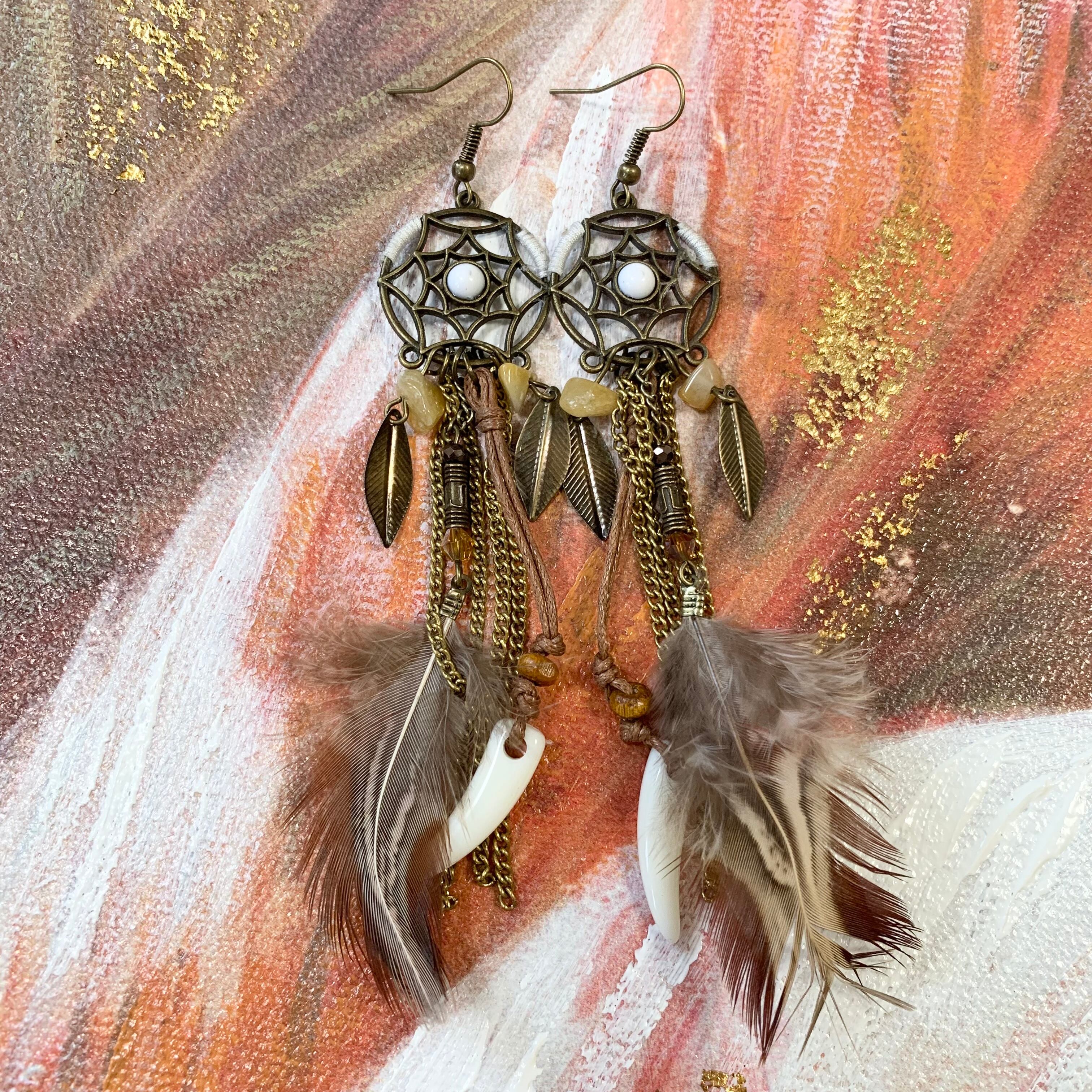 ドリームキャッチャーをモチーフにした、肩までの長めのピアス。